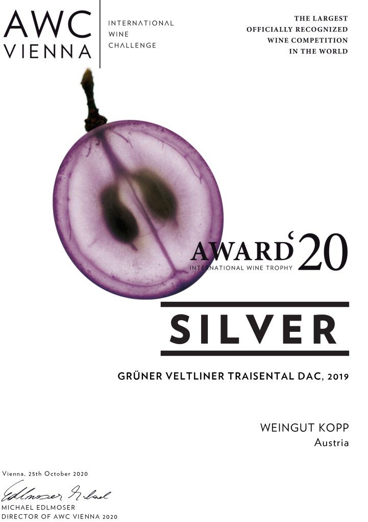2020 wurde unser Grüner Veltliner DAC unter 1.500 Konkurrenten aus 41 verschiedenen Nationen mit dem Silver Award ’20 ausgezeichnet.